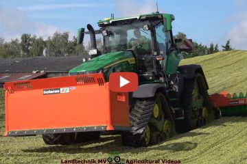 LU. Carsten Meyer bei der Maissilage 2023 — mit einem John Deere 9900i, für den Transport sind verschiedene John Deere und Claas Traktoren mit Krone und Schuitemaker Anhängern im Einsatz, Auf dem Silo arbeiten ein John Deere 8RX 310 und ein JCB 435S.
