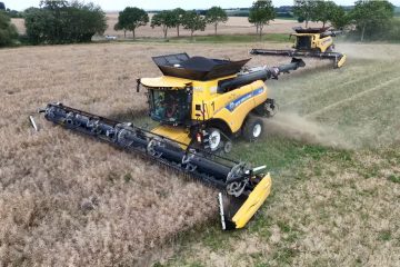 Stefan Lübke — Zwei New Holland CR 10.90 mit mit zwei 12m breiten MacDon FlexDraper bei der Rapsernte