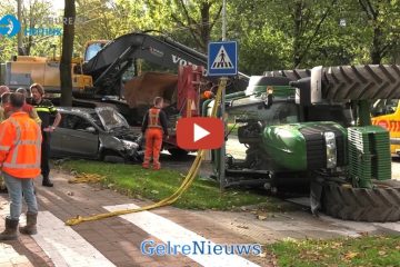 Bizarrer Unfall in Arnheim; Traktor fällt auf die Seite und auf ein Auto