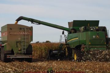 Landtechnik MV – Agricultural Videos — Körnermais dreschen mit einem John Deere T670i mit Geringhoff Mais Star Horizen, für die Bunkerleerung ist ein Fendt 933 auf Zwillingen mit Bergmann GTW 330. Für den Abtransport wird dann auf einen DAF LKW ungeladen.