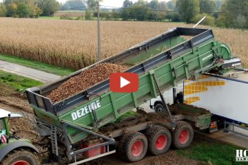Mydibel erntet Kartoffeln mit drei Dewulf Kwatro auf einem Feld. Vor dem Entladen auf den LKWs reinigt eine Dezeure Tridem-Überladung den letzten Schmutz mit einem Dezeure Turbocleaner. – Farm Machinery Europe