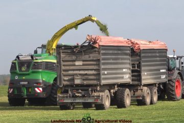 Landtechnik MV – Agricultural Videos — Agrarservice Nordost beim letzten Schnitt mit einem John Deere 9700i, vorweg läuft ein John Deere 6230R mit einem nagelneuem Krone Swadro 2000. Für den Transport sind verschiedene John Deere und Fendt Traktoren sowie MAN Agrotrucks im Einsatz