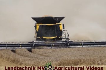 Neuer NH CR 11 mit 15,20 Meter MacDon Schneidwerk beim Fieldcamp von New Holland. Für die Bunkerleerung ist ein New Holland T 8.435 mit Annaburger Umladewagen HTS 34.16 im Einsatz – Landtechnik MV – Agricultural Videos