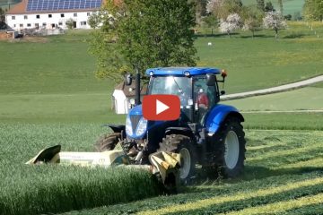 Der erste Landwirt in der Umgebung hat sich an den Grünroggen getraut. Hier zusehen ein New Holland T7.185 mit Krone Mähkombi. — Moareida Agrar