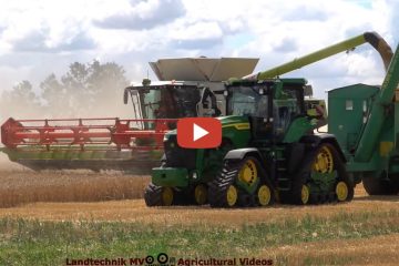 2022 Getreideernte mit zwei Claas Lexion 770 TT mit jeweils 10,80 Meter Schneidwerk. Für die Bunkerleerung ist ein John Deere 8RX 410 mit Hawe Überladewagen im Einsatz, weitere John Deere Traktoren sind für den Abtransport zuständig. — Landtechnik MV – Agricultural Videos