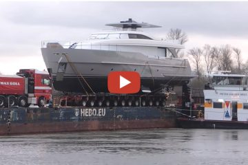 Schwertransport vom Ponton – Yachten zur Boot 2023 – Auch dieses Jahr kommen ein paar Yachten nicht direkt über das Wasser, sondern für Tieflader vorbereitet auf einem Ponton