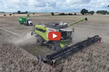 AgrarBlick – Lohnunternehmen Westhoff. Rapsernte 2023 trotz Regenwetter — Der Raps wird mit einem Claas Lexion 7600 Terra Trac Mähdrescher geerntet. Abgefahren wird mit dem Raupenschlepper Caterpillar – Claas Challenger CH 85 E Raupe