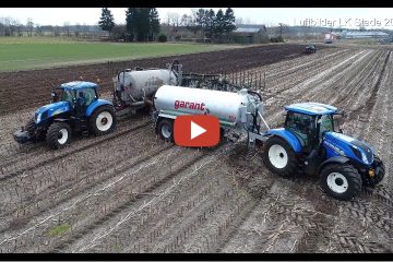 Die Rindergülle wird bodennah ausgebracht mit einem New Holland T6090 (225ps) und einen 14 cbm Güllefass von der Marke Joskin — Luftbilder LK Stade