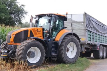 Maisernte 2025 mit dem Lohnunternehmen Struß. Es fahren ein John Deere 9900i Feldhäcksler, Abfahrgespanne von John Deere und Claas mit Briri, Krampe und Stapel Anhängern. Auf dem Silo fahren ein JCB Radlader und eine weitere Maschine, EmsAgriFilm