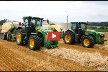 Getreideernte mit mit zwei John Deere S 685i, die Bunkerleerung übernimmt ein John Deere 8370 RT mit Horsch Titan 34 UW. Für den Abtransport sind verschiedene John Deere Trakroren im Einsatz. Ein JCB 8330 mit Horsch Terrano 5.4 GX ist zur Vorführung im Einsatz. Landtechnik MV – Agricultural Videos