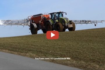 Hier ist ein Claas Axion 850 mit einem Rauch AGT Dügerstreuer mit 36 Meter Gestänge zu sehen. — Landtechnik MV