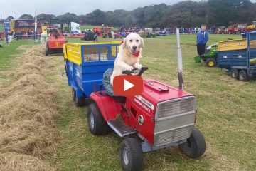 Rambo der Golden Retriever fährt Massey-Traktor.