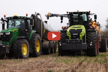 Gülle ausbringen mit einem Claas Xerion 4200 Trac VC, einem Veenhuis Premium Integral Fass beim Landwirt in MV. Für den Transport sind verschiedene Fendt und John Deere Traktoren im Einsatz. — Landtechnik MV – Agricultural Videos