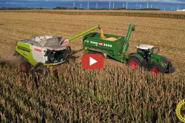 Agrar Paparazzi — BIO Körnermais Dreschen — Hier ist ein Claas Lexion 780 mit einem Geringhoff Mais Star Horizon am BIO Körnermais Dreschen zusammen mit einem Fendt 936 Vario mit einem Hawe Überladewagen der am Feldrand die LKWs befüllt.