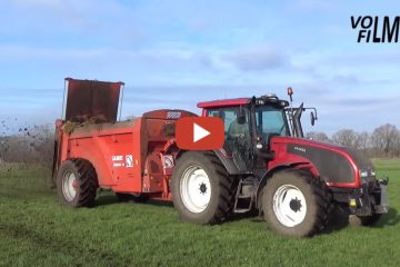 VolmerFilm 2023 – Stalldünger streuen auf Grünland durch Lohnunternehmen Roossink. Valtra T130 Traktor und Gilibert Helios 14 Streuer
