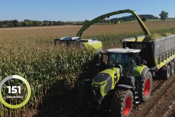 Mais häckseln auf Zeit: Wie schnell füllt der Claas Jaguar 1200 den Fliegl Cargos 760 Tridem? agropictures