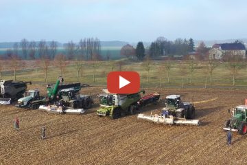 AgrarBlick 2021 – Körnermais wird mit einem Mähdrescher Claas Lexion 7600 Terra Trac ( Raupenlaufwerk ) vom Lohnunternehmen Westhoff Agrar GmbH geerntet. 2x weiße Claas Xerion 5000