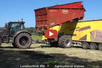 Agrarbetrieb Bandt im ersten Schnitt mit einem Claas Jaguar 980. Zwei Valtra T234 mit Vicon T-Rex Shuttle sind für das Überladen auf die bereitstehenden LKW im Einsatz. –Landtechnik MV – Agricultural Videos