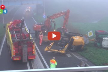 Traktor mit Bagger kippt nach der Kollision mit der Eisenbahnbrücke –