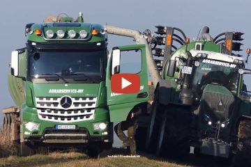 Landtechnik MV– 2019: Agrarservice MV beim Gülle ausbringen mit einem Fendt 929 und Kaweco Double Twin Shift Faß. Angeliefert wird von 2 MB LKW