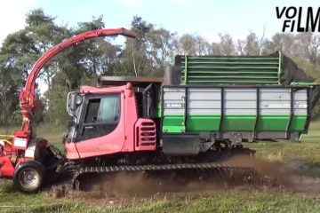 VolmerFilm – 2024 – Gras mähen und häckseln in Naturschutzgebieten von Vossebeld Cultuurtechniek: Schwadmäher Vicon WR 322 mit Raupenketten und Scheibenmäher. Leitner Pistenbully 300 Kettenfahrzeug mit Pöttinger MEX 6 Häcksler und Deutz-Fahr K550 Ladewagen.