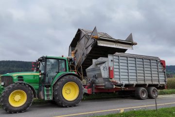 Sturmmaisernte ins Hochsilo — Bucher Erntetechnik AG bei der Maisernte mit seinem Eigenbau Raupenbunkerhäcksler und Eigenbau Gebläse, feruontour