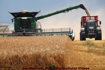 Getreideernte mit einem John Deere X9 1100 und zwei Claas Lexion 770, leider hatte einer zu diesem Zeitpunkt ein Problem. Für den Transport sind veschiedene Fendt Traktoren mit Krampe Kippern im Einsatz. – Landtechnik MV – Agricultural Videos