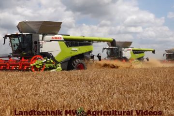 Getreideernte mit 6 neuen Claas Lexion 8800, jeweils mit 1380 Convio Schneidwerk. Für die Bunkerleerung sind 3 Fendt 942 mit Hawe 4000 und 5000 ULW im Einsatz. Den Abtransport übernehmen verschiedene Fendt Traktoren mit Krampe Kippern und einige MAN LKW. — Landtechnik MV – Agricultural Videos