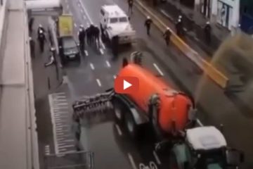 Polizei mit Wasserwerfer ziehen sich vor Bauern mit Traktoren und Güllefaß zurück -Innenstadt Brüssel Polizei mit Räumfahrzeug will Bauern aufhalten Bruxelles agriculture