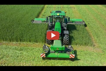Lohnunternehmen Schimmel aus Overberg 2022 mäht Frühjahrsroggen mit einem John Deere 6175R mit John Deere Triple-Mähwerken. — Mike van den Hardenberg