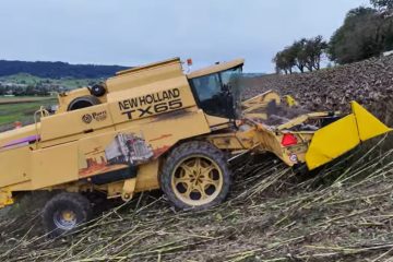 feruontour — Burri Maschinenbetrieb mit seinem Mähdrescher Mähdrescher TX65 mit Doppelräder am Sonnenblumen dreschen am Hang