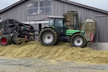 Ein Deutz Fahr M35.80 und ein Claas Lexion 670 beim Gerste dreschen 2016 – LU Rupp