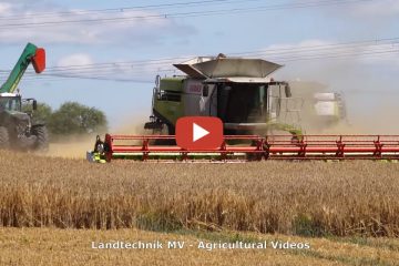 Getreideernte mit zwei Claas Lexion 770TT . Für das Abbunkern sind Zwei Fendt mit Hawe Überladewagen im Einsatz. — Landtechnik MV – Agricultural Videos