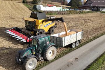 feruontour — Mais dreschen — Lohnunternehmer Müller mit seinem Rotormähdrescher New Holland CR7.90 mit der Bereifung 900/60R42 an der Vorderachse und 600/70R30 an der Hinterachse.