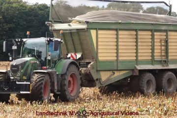 Maishäckseln mit einem Fendt Katana 850 und Kemper 490pro Maisgebiss, für den Transport sind verschiedene Fendt Traktoren und ein MB LKW im Einsatz. Auf dem Silo arbeiten ein Fendt 936 und ein Pisten Bully 300 Polar. V. Landtechnik MV – Agricultural Videos
