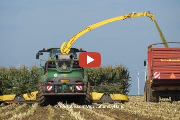 Maishäckseln 2023 mit einem John Deere 9900i mit 12-reihigem Kemper 490 plus. Der Mais wird vom Lohnunternehmen Peters auf ein großes Feld in Nordrhein-Westfalen — Agriculture by Hans
