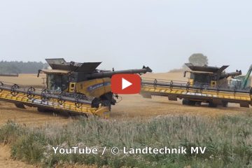 Landtechnik MV – Agricultural Videos – Getreideernte mit 3 New Holland 10.90 und 2 Fendt 1050 jeweils mit Hawe Überladewagen.