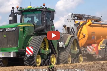 John Deere 9620RX mit Veenhuis Tridemfaß und angebauter Horsch Scheibenegge beim ausbrigen von Gülle. Als Zubringer sind verschiedene Claas und John Deere Traktoren — Landtechnik MV – Agricultural Videos
