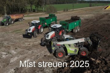 AgrarBlick — Die Mitarbeiter vom Lohnunternehmen Agrar Technik Sementek aus Kummer bei Ludwigslust, verteilen mit zwei Steyr Traktoren mit TEBBE Tandem Streuer den hofeigenen Kuhmist von der nahegelegenen Landgenossenschaft Pröttlin.
