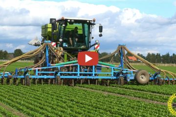 A. P. — Claas Xerion 3800 mit einer 12 Meter breiten Hacke von Schmotzer um das Unkraut im Gemüseanbau zu hacken, in diesem Fall war hier Mini Romana Salat gepflanzt auf dem Feld