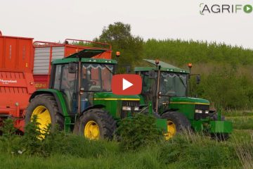 Agrifoto – Grasernte mit Youngtimern. John Deere 6400 und 6310 mit Taarup 465 Ladewagen.