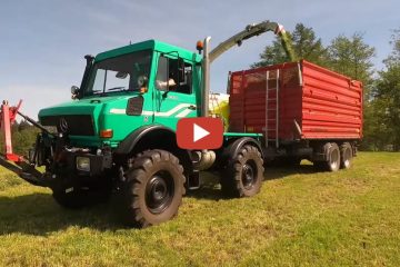 Nach der Restauration das erste Mal im Arbeitseinsatz: unser Unimog 1600 Agrar mit dem Pühringer 16t-Kipper beim Häckslen 2020 — STARS of Bavaria