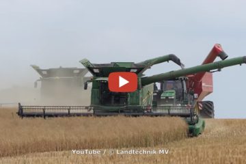 Raps Ernte mit 2 John Deere S685 i, zur Bunkerleerung sind ein John Deere 8370 RT und für den Transport ist ein Claas Axion 950
