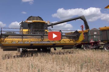 AgrarBlick – Rapsernte 2019 bei Bad Bevensen. Im Einsatz ist ein New Holland CX 8090 Mähdrescher mit Rapsschneidwerk.