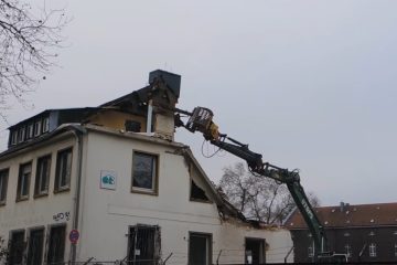 Bagger mit dem Abriss Greifer und jede Menge Staub