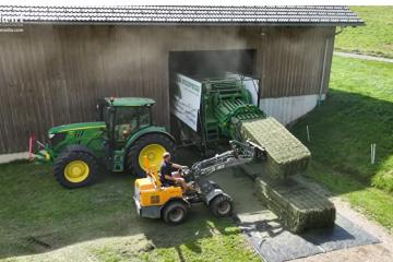 Eigenbau-Heustockpresse — Man nehme eine Quaderballenpresse, einen LKW-Anhänger mit Tandemachse und einen alten Ladewagen – fertig ist die Heustockpresse. landwirt-media