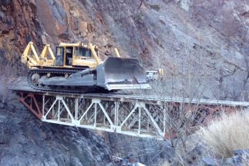 Bulldozer auf wackeligen Brücke ohne Operator. Sehen, ob das funktioniert