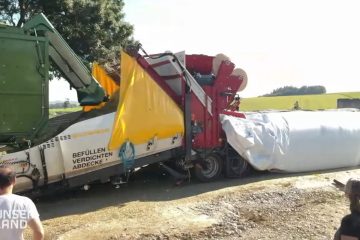 Hightech Landtechnik beim Silo Mais — Mais ernten: Die riesige Silospeed Siliermaschine ist eine Art Wurstpresse für Mais und Gras. Ein Maishäcksler erntet am Feld den Silo Mais, danach kommt der Mais aber nicht in ein herkömmliches Fahrsilo