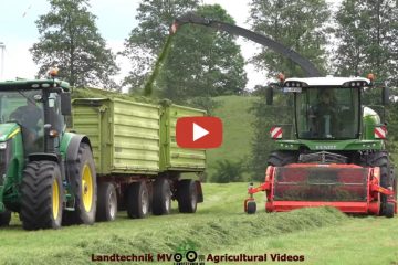 Agrarservice Rustow mit einem Fendt Katana 650 und Kemper P 3003 Pick Up im ersten Schnitt. Für den Transport sind verschiednen John Deere Traktoren mit Conow Anhängern im Einsatz — Landtechnik MV – Agricultural Videos