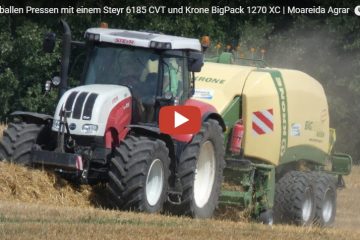 Moareida Agrar Quaderballen Pressen mit einem Steyr 6185 CVT und Krone BigPack 1270 XC – Insgesamt wurden auf dem Feld 173 Ballen gemacht. Weniger als normal.